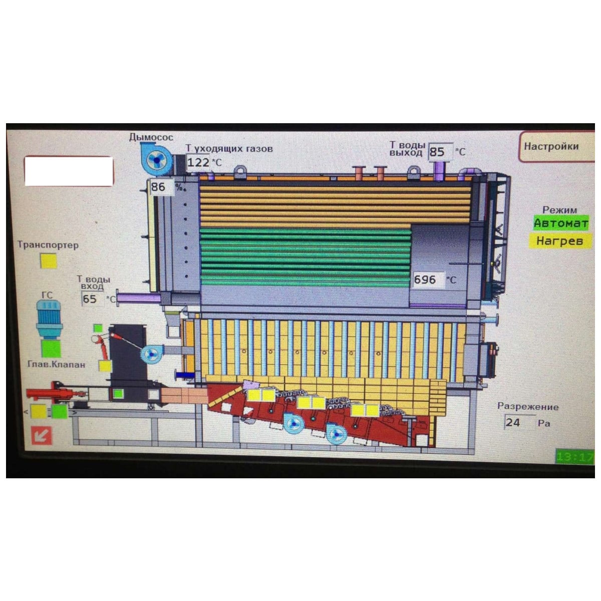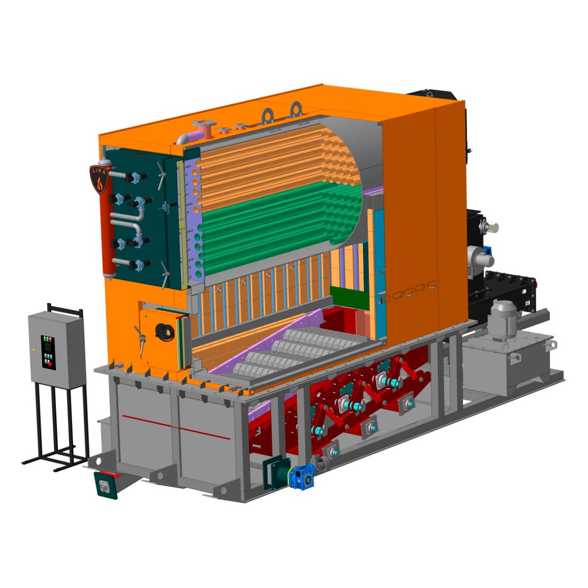 Подача сыпучих видов твердого топлива внутрь топки котла КВТ-МА может осуществляться шнековыми транспортерами для топлива или гидравлическим плунжером. Топливо подается на подвижную колосниковую решетку. Для более качественного и полного сжигания топлива вся область колосниковой решетки разделена на три зоны. Первая зона – зона просушки и подготовки топлива. Вторая зона – зона активной газификации и горения топлива. Третья зона – зона дожигания. В каждой зоне частота движения подвижных колосников разная и регулируется независимо друг от друга, что позволяет использовать топливо различной сложности. Первичный воздух подается зонами под колосниковую решетку через отверстия, расположение на поверхности колосников. Колосниковая решетка охлаждается первичным воздухом. Вторичный воздух подается через ряд отверстий, расположенных вдоль колосниковой решетки с возможностью регулирования вторичного воздуха в каждой зоне. Автоматика котла обеспечивает постоянство тяги в топки при помощи токового датчика разряжения. Лямбда-зонд позволяет подобрать оптимальное количество кислорода для горения. Присутствует интеллектуальная система анти возгорания топлива в шнековых транспортерах (или гидравлическом плунжере), а также термостатический трехходовой клапан пожаротушения. Котлы и оборудование подачи топлива — это единые комплексы, управляемые процессором (контроллером), которые могут работать в автоматическом режиме.