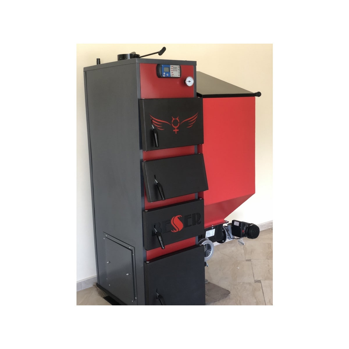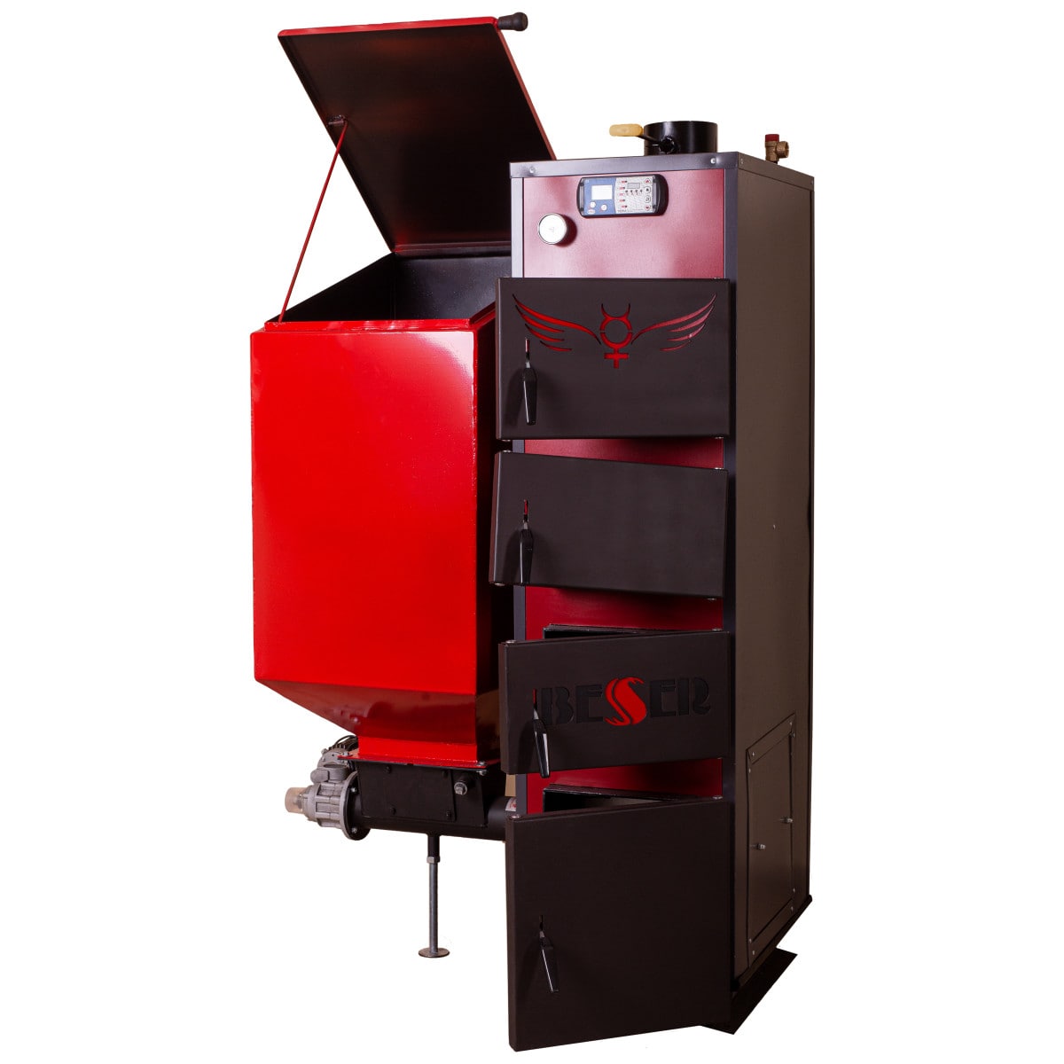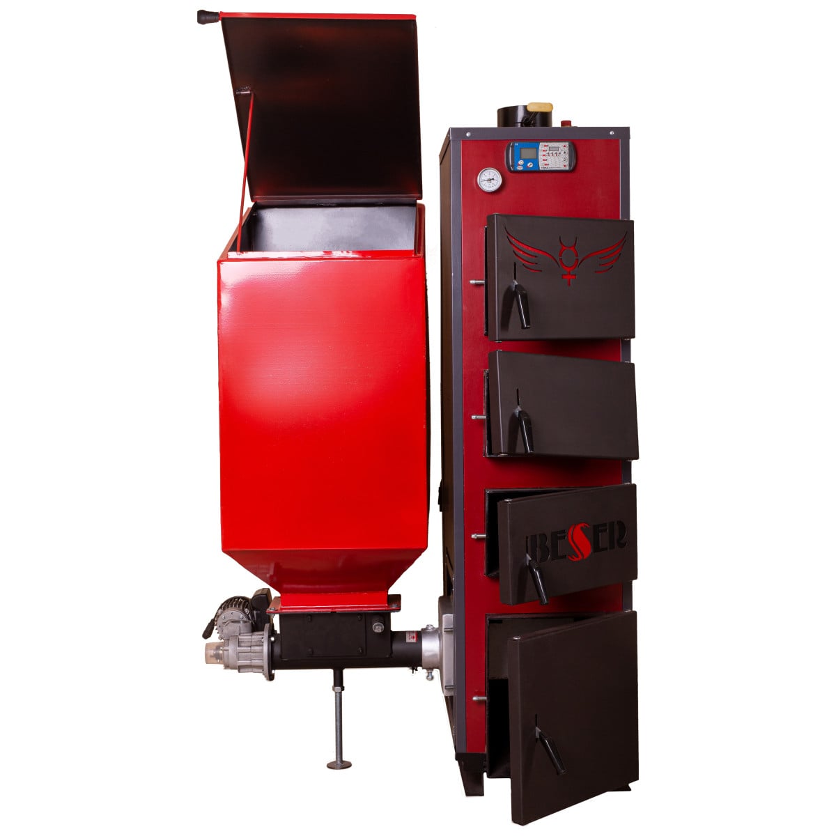 На передней лицевой поверхности котла расположены дверцы для прочистки конвективных поверхностей, в т.ч. вторая и третья сверху дверцы котла используются также для загрузки резервного крупнокускового топлива для кратковременного использования (дрова, брикет), через которые производится загрузка топлива в топку (камеру сгорания). Нижняя дверца на лицевой части котла предназначена для обслуживания горелки и очистки котла от твердых продуктов сгорания.