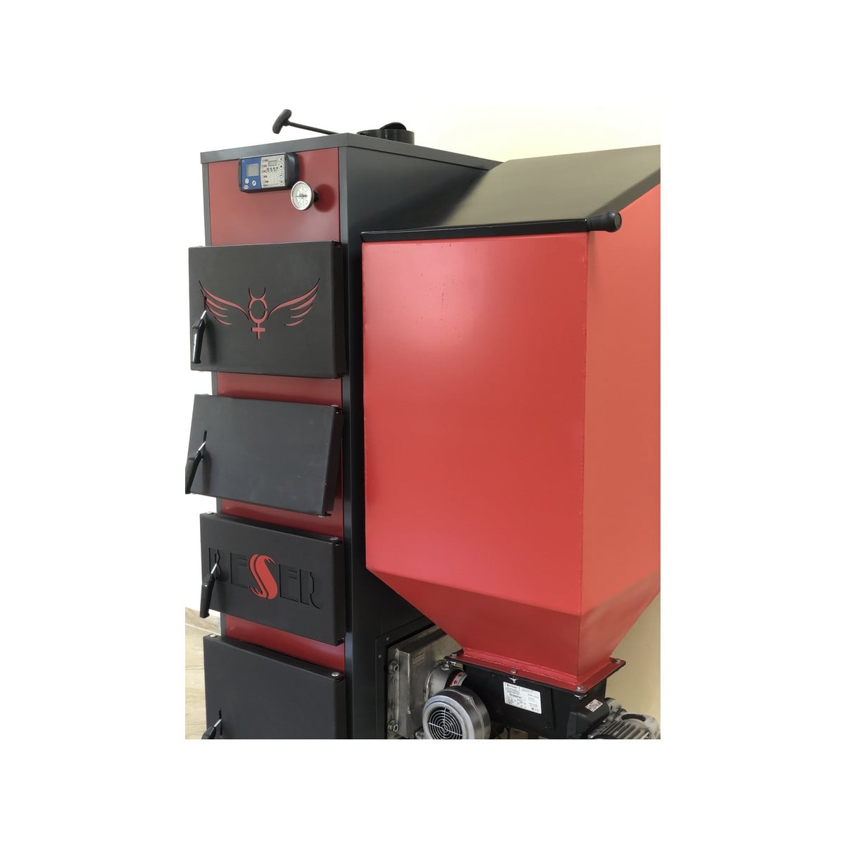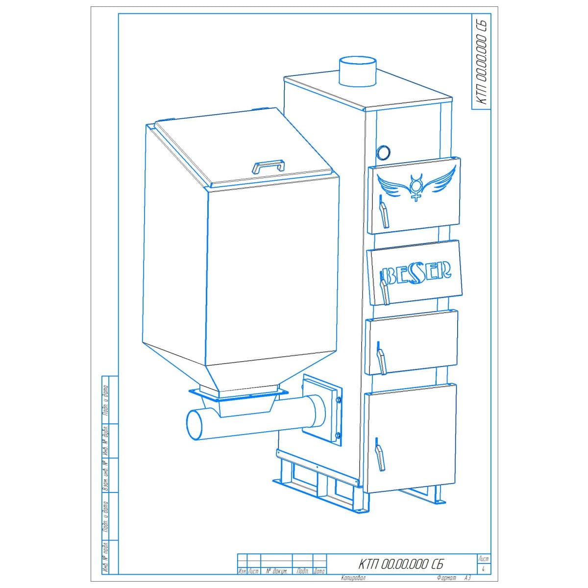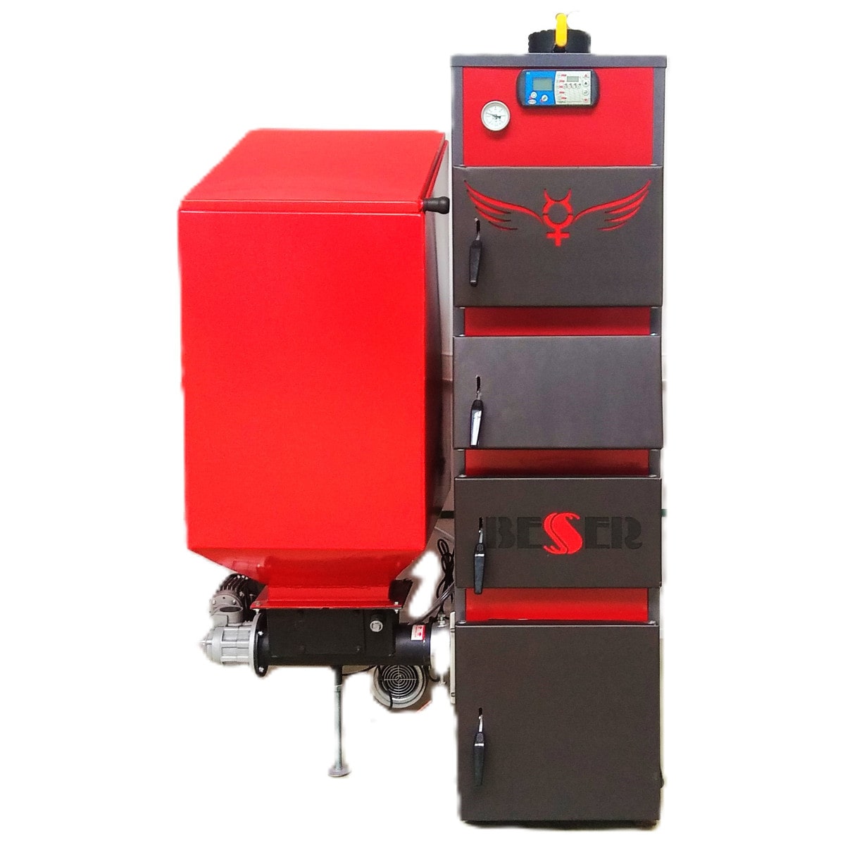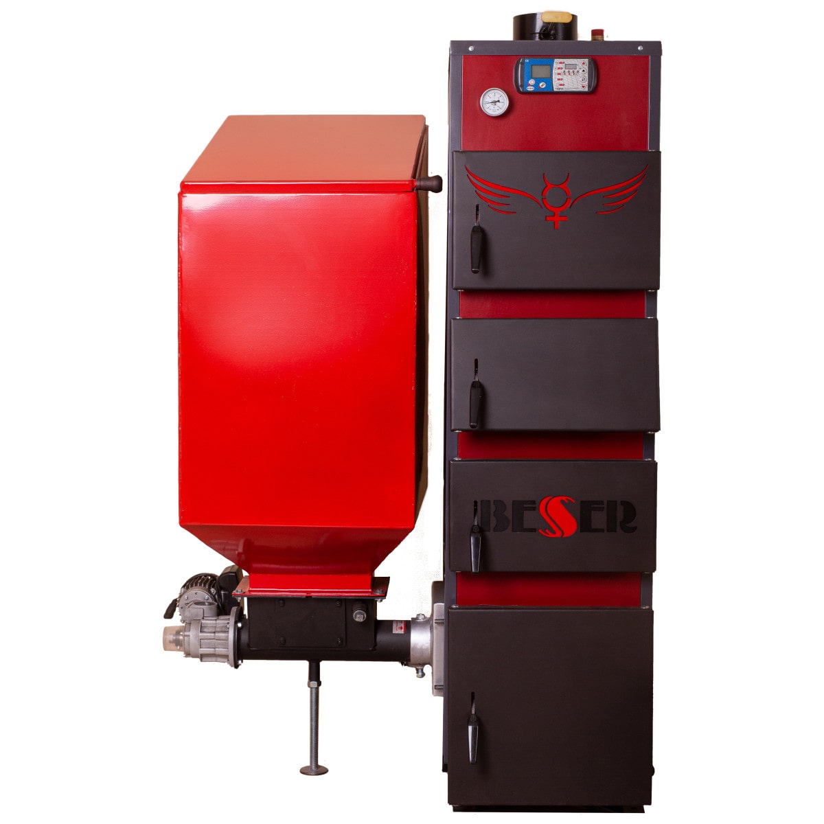 На передней лицевой поверхности котла расположены дверцы для прочистки конвективных поверхностей, в т.ч. вторая и третья сверху дверцы котла используются также для загрузки резервного крупнокускового топлива для кратковременного использования (дрова, брикет), через которые производится загрузка топлива в топку (камеру сгорания). Нижняя дверца на лицевой части котла предназначена для обслуживания горелки и очистки котла от твердых продуктов сгорания.