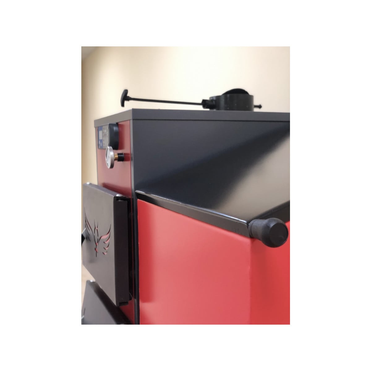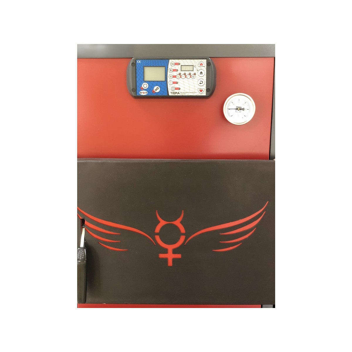 Наружная поверхность водяной рубашки котла защищена изоляцией и закрыта обшивкой. На верхней поверхности котла находится патрубок для установки клапана предохранительного 3/4″ (3bar), служащего для защиты системы от превышения давления и сброса избыточного давления. Термометр биметаллический установлен стационарно в теле котла на его лицевой фронтальной поверхности. Манометр устанавливают на трубопроводе системы отопления или группы безопасности для контроля параметров теплоносителя.