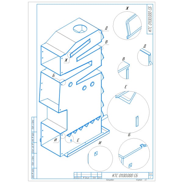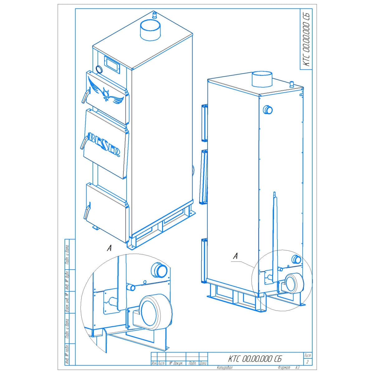 Котел представляет собой стальную цельносварную конструкцию с верхним сгоранием твердого топлива состоящую из топки (камеры сгорания) со встроенными трубами, одновременно являющуюся загрузочной камерой и камеры поворотной (дожигания), разделенной перегородками.