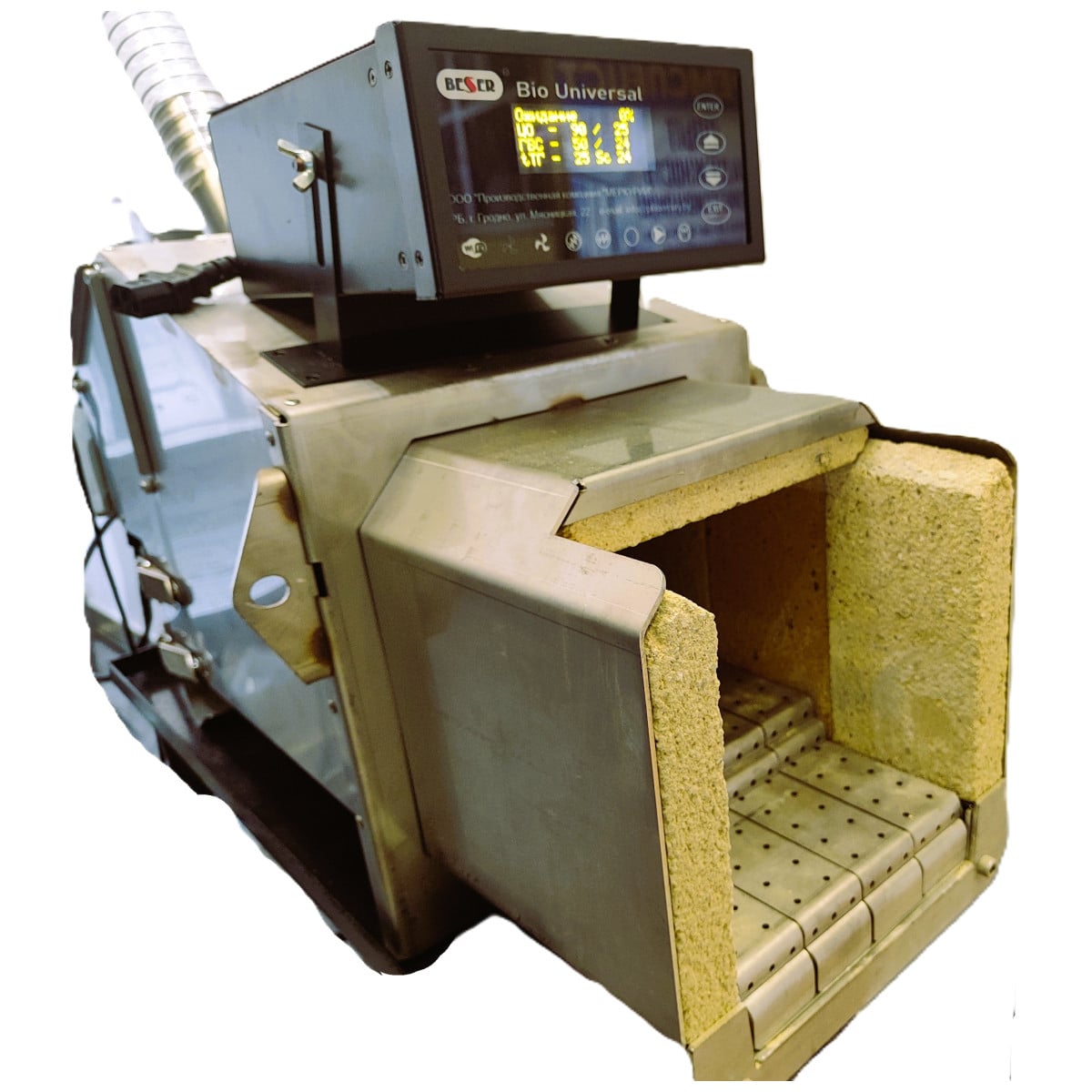 Корпус горелки является основным элементом, выполняющим также роль основания для установленного внутри оборудования, включая подвижные колосниковые решетки и систему автоматического розжига. Подходит для пеллет плохого качества и агро-пеллет, непрерывно в процессе горения топлива обеспечивает самоочистку за счет циклического возвратно-поступательного движения колосников.